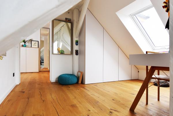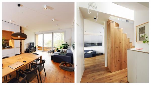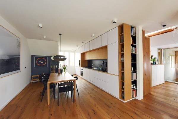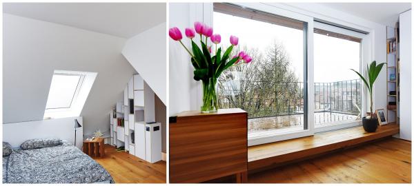 Poleg številnih novih okenskih odprtin, tako tudi strešnih, so svetlost stanovanja še povečali z izbiro barv: bela na pohištvu, stenah in okenskih okvirjih ter barva lesa, ki doda pridih topline.