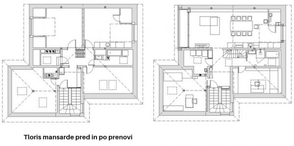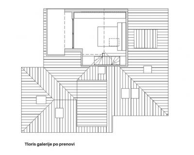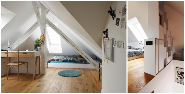 Zaradi kompleksnosti strešne konstrukcije in majhne višine so v podstrešni del stanovanja v obstoječo streho na več mestih premišljeno vgradili strešna okna Velux, da so dosegli funkcionalno optimalno izrabo podstrešja in stojno višino – nad delovno mizo, pri postelji. Z vgradnjo strešnih oken v ravnini strešine so notranji prostori maksimalno osvetljeni in delujejo prostorno. Vstop svetlobe z vrha prinaša v majhno podstrešje dinamiko spreminjanja jakosti svetlobe preko dneva.