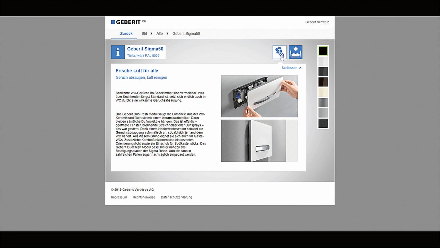 Da bi inštalaterjem in načrtovalcem olajšali svetovanje strankam, je podjetje Geberit na svoji spletni strani objavilo obnovljeni konfigurator aktivirnih tipk. Ta na jasen način zagotavlja pregled ponudbe aktivirnih tipk, postopek iskanja pa podpira z intuitivnim vodenjem. Po vsakem kliku so na voljo nadaljnje informacije o barvah, materialih, možni uporabi in funkcijah posameznega modela. Vzorčne slike služijo kot navdih za lastno sanjsko kopalnico.